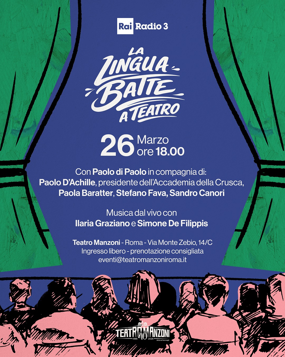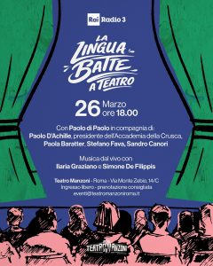 Con l’arrivo della primavera quest’anno “La lingua batte” sbarca a teatro! Il programma domenicale di Radio3, che esplora il paesaggio della lingua italiana ed è condotto dallo scrittore Paolo Di Paolo, vedrà ospiti del Teatro Manzoni di Roma i prossimi 26 marzo, 29 aprile e 27 maggio personalità che racconteranno le novità culturali e la lingua italiana davanti a un pubblico di appassionati: studiose e studiosi, scrittori e scrittrici, artiste e musicisti, figure del teatro e della stand up comedy, che ci aiuteranno a leggere la contemporaneità attraverso il filtro illuminante della lingua. In un appuntamento mensile preserale, dalle 18 alle 19, si alterneranno: